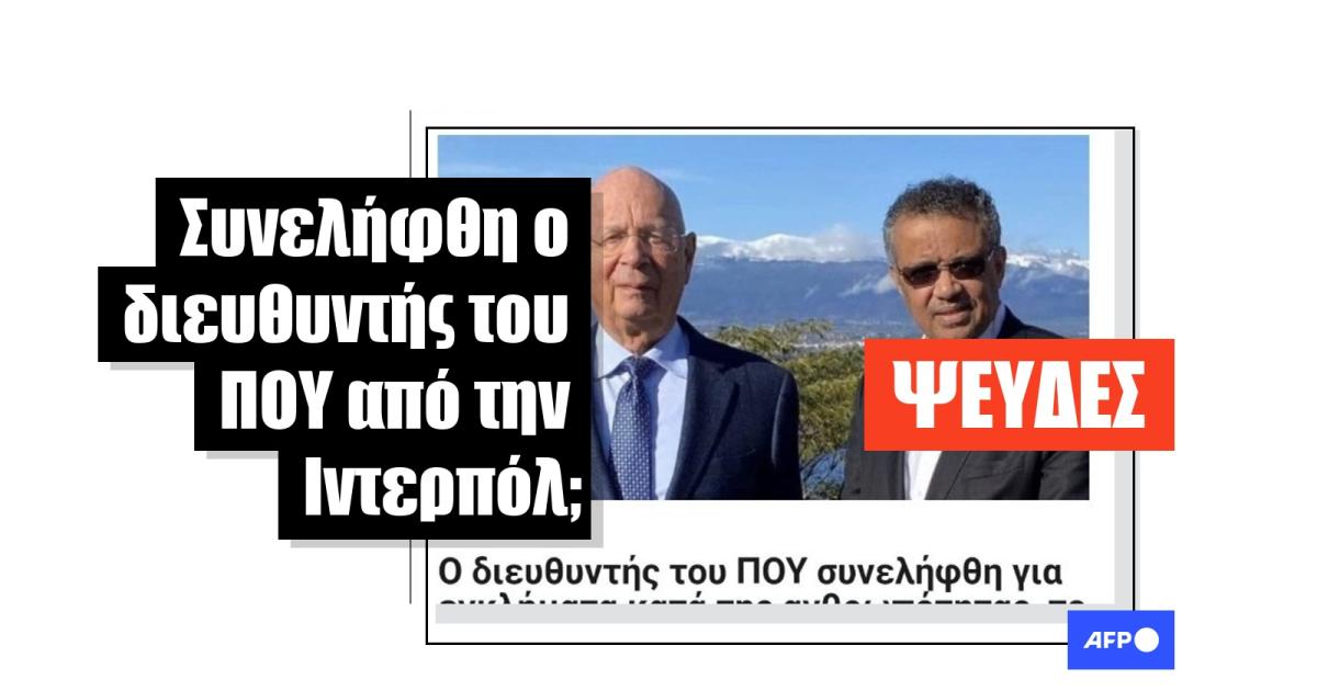 «Ο διευθυντής του ΠΟΥ συνελήφθη για εγκλήματα κατά της ανθρωπότητας!», αναφέρει μια ανάρτηση στο Facebook από τις 25 Ιουλίου που κοινοποιήθηκε δεκάδες φορές. Η ανάρτηση παραθέτει μια φωτογραφία του Τέντρος Αντάνομ δίπλα στον Κλάους Σβαμπ, ιδρυτή του Παγκόσμιου Οικονομικού Φόρουμ (WEF) και έναν σύνδεσμο σε άρθρο των Vancouver Times.