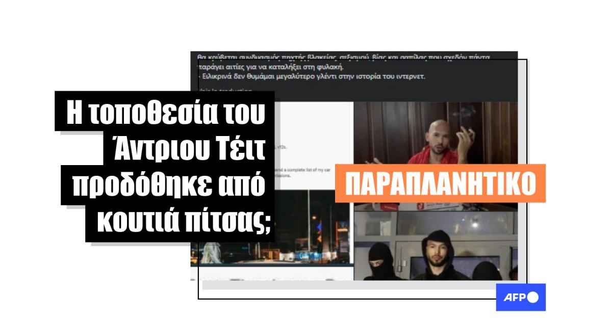 «Έλα όμως που το φυντάνι [Άντριου Τέιτ, σ.σ.] ήταν υπό έρευνα από τις Ρουμανικές αρχές για συμμετοχή σε κύκλωμα trafficking και το κουτί από την πιτσαρία έδειξε ότι όντως ήταν στη χώρα, οπότε η αστυνομία μπούκαρε και τον συνέλαβε», αναφέρει μια ανάρτηση στο Facebook από τις 30 Δεκεμβρίου 2022.