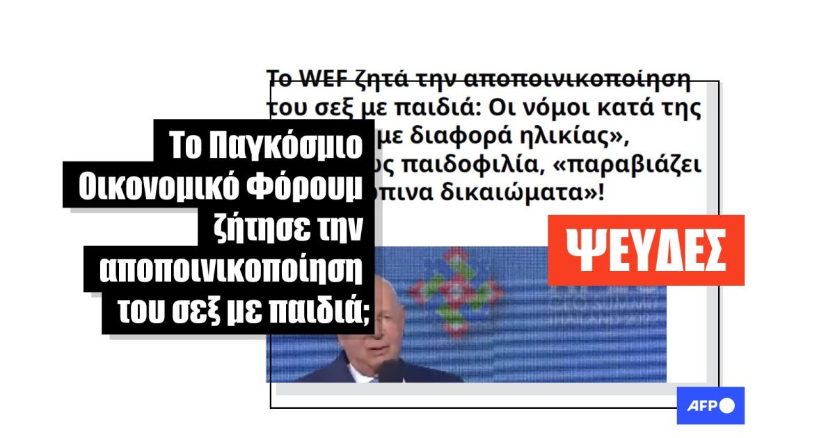 «Το WEF ζητά την αποποινικοποίηση του σεξ με παιδιά: Οι νόμοι κατά της "αγάπης με διαφορά ηλικίας", γνωστό ως παιδοφιλία, "παραβιάζει τα ανθρώπινα δικαιώματα"!» υποστηρίζει ο τίτλος ενός άρθρου στα ελληνικά που δημοσιεύθηκε στις 4 Ιανουαρίου 2023 και έχει κοινοποιηθεί εκατοντάδες φορές στο Facebook μέχρι σήμερα, σύμφωνα με το εργαλείο παρατήρησης των μέσων κοινωνικής δικτύωσης CrowdTangle. Αναρτήσεις στο Facebook από τις 8 και 10 Ιανουαρίου αναπαράγουν τους ψευδείς ισχυρισμούς. Συγκεκριμένα, η δεύτερη αντιγράφει το κείμενο που δημοσιεύθηκε στο ιστολόγιο, ενώ η πρώτη παραπέμπει σε αυτό ως πηγή, στο πρώτο σχόλιο κάτω από την ανάρτηση.