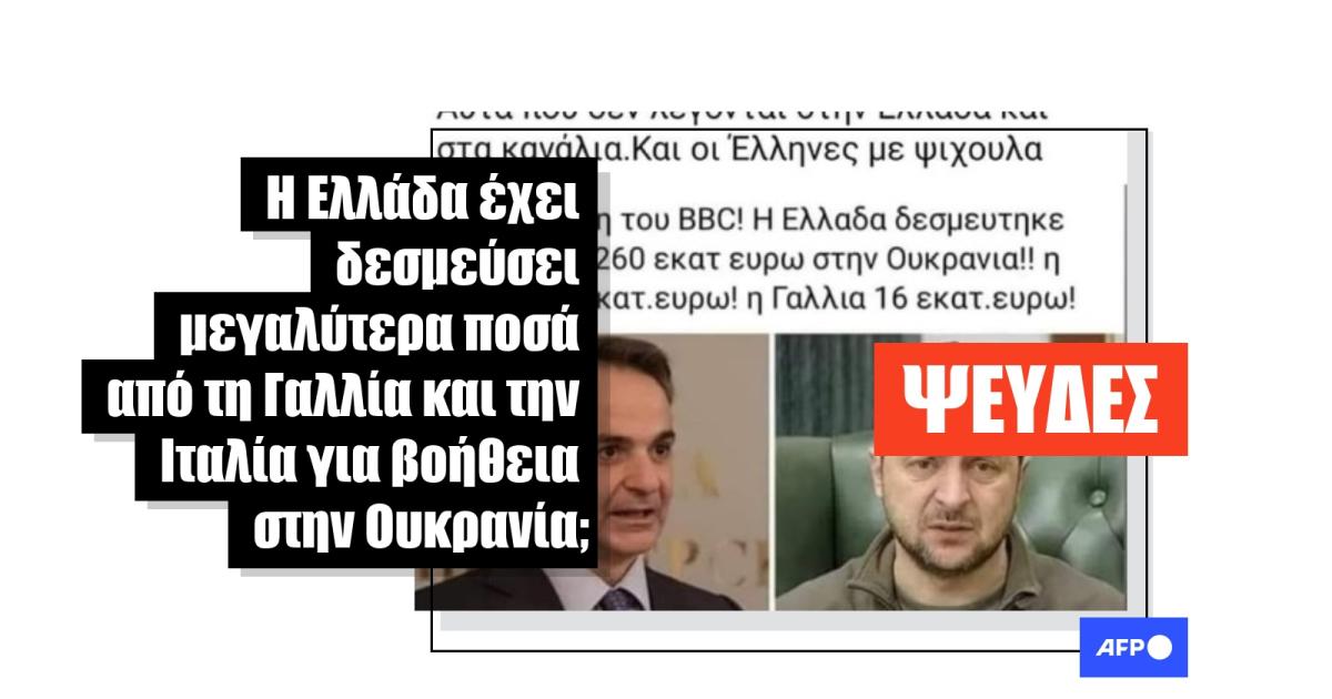 «BBC. Παρουσίασε τα ποσά που έχουν δεσμευτεί να διαθέσουν οι Ευρωπαϊκές χώρες για την Ουκρανία. Η Ελλάδα (σωστά μαντέψατε) είναι από τις πρώτες στο κουβαρνταλίκι...Δεσμεύτηκε να διαθέσει...260 εκατομμύρια ευρώ!! Και για να έχουμε ένα μέτρο σύγκρισης: Η Γαλλία δεσμεύτηκε να διαθέσει 16 εκατομμύρια (δεκαέξι) και η Ιταλία 11 εκατομμύρια!!!» αναφέρεται σε ανάρτηση στο Facebook με τον ψευδή ισχυρισμό που κοινοποιήθηκε περισσότερες από 150 φορές από όταν δημοσιεύθηκε στις 21 Ιανουαρίου 2023.