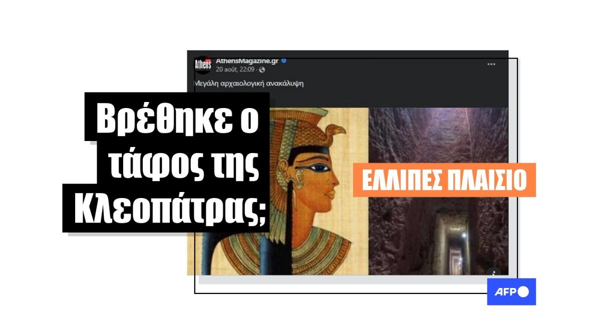 «Βρέθηκε ο τάφος της Κλεοπάτρας - Ανακαλύφθηκε εντυπωσιακή σήραγγα κάτω από αρχαίο ναό», τιτλοφορείται άρθρο που δημοσιεύτηκε από το Athens Magazine, ένα διαδικτυακό μέσο ενημέρωσης, στις 20 Αυγούστου 2023. Το άρθρο έχει επίσης κοινοποιηθεί στο Facebook περισσότερες από 580 φορές.