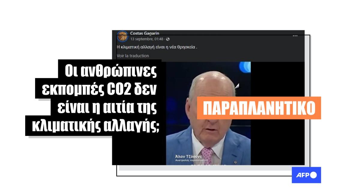 «Το διοξείδιο του άνθρακα αποτελεί το 0,04 του ποσοστού της ατμόσφαιρας. Αυτό ισχύει για ολόκληρο τον κόσμο. Τα ανθρώπινα όντα δημιουργούν μόνο το 3% αυτού του 0,04% σε ολόκληρο τον κόσμο. Και η Αυστραλία, οι άνθρωποι, οι κατασκευαστές, οι αγελάδες, οι πυρκαγιές στους θάμνους, είναι υπεύθυνοι για το 1,3%, από το 3%, από το 0,04%», λέει ο παρουσιαστής Άλαν Τζόουνς σε ένα βίντεο με ελληνικούς υπότιτλους που κοινοποιήθηκε πάνω από 890 φορές στο Facebook στις 13 Σεπτεμβρίου 2023. Ο ίδιος προσθέτει: «Προτείνει κανείς στα σοβαρά να στήσουμε την οικονομία επί της κεφαλής, να ανεβάσουμε τις τιμές της ενέργειας, να ζημιώσουμε τις επιχειρήσεις, να θέσουμε σε κίνδυνο την απασχόληση επειδή το 0,04% της ατμόσφαιρας είναι διοξείδιο του άνθρακα;».