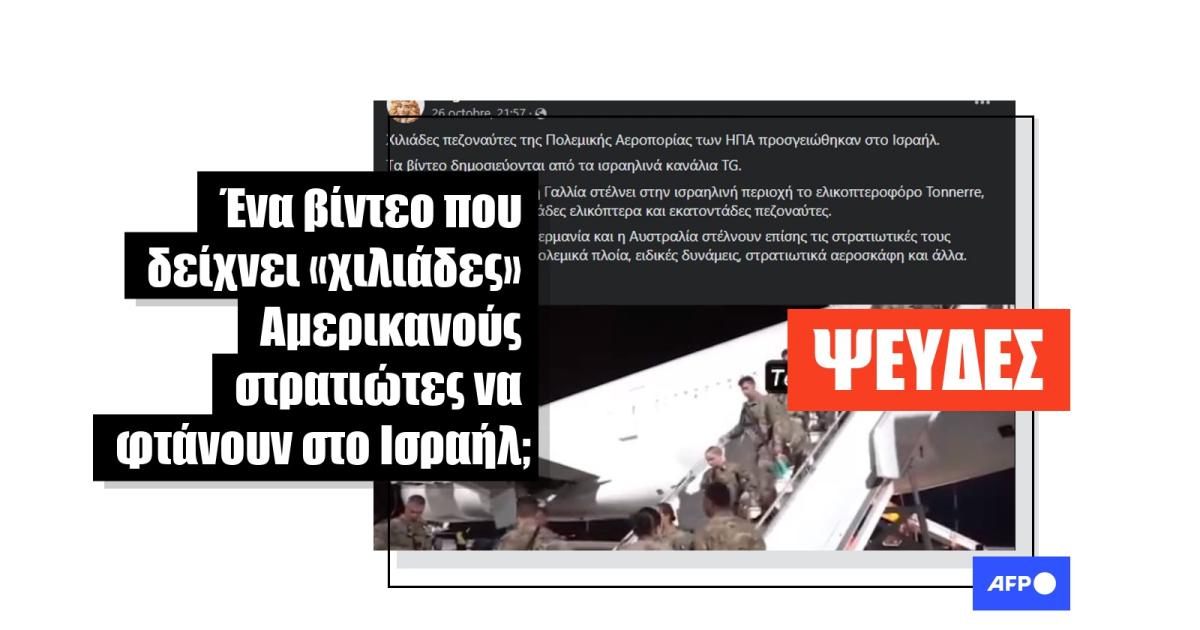 «Χιλιάδες πεζοναύτες της Πολεμικής Αεροπορίας των ΗΠΑ προσγειώθηκαν στο Ισραήλ», αναφέρει μια ανάρτηση στο Facebook από τις 26 Οκτωβρίου 2023. Η ανάρτηση κοινοποιεί ένα βίντεο που υποτίθεται ότι δείχνει Αμερικανούς στρατιώτες, που περιγράφονται ως «πεζοναύτες της Πολεμικής Αεροπορίας» να αποβιβάζονται από ένα αεροπλάνο σε ένα αεροδρόμιο. Η περιγραφή της ανάρτησης προσθέτει: «Αναφέρουν επίσης ότι η Γαλλία στέλνει στην ισραηλινή περιοχή το ελικοπτεροφόρο Tonnerre, ικανό να μεταφέρει δεκάδες ελικόπτερα και εκατοντάδες πεζοναύτες. Η Μεγάλη Βρετανία, η Γερμανία και η Αυστραλία στέλνουν επίσης τις στρατιωτικές τους ομάδες στην περιοχή, πολεμικά πλοία, ειδικές δυνάμεις, στρατιωτικά αεροσκάφη και άλλα».