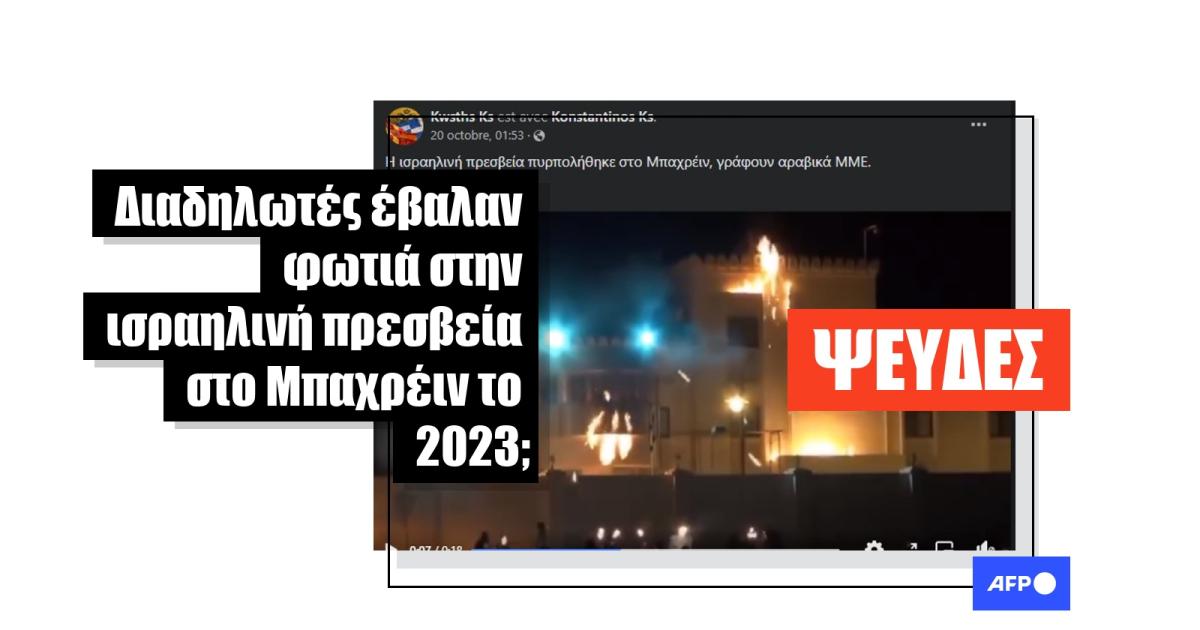 «Η ισραηλινή πρεσβεία πυρπολήθηκε στο Μπαχρέιν, γράφουν αραβικά ΜΜΕ», γράφει μια ανάρτηση στο Facebook στις 20 Οκτωβρίου 2023. Η ανάρτηση κοινοποίησε ένα βίντεο που δείχνει ανθρώπους να πετούν μολότοφ σε ένα κτίριο που βρίσκεται πίσω από έναν μεγάλο τοίχο. Παρόμοιες αναρτήσεις κοινοποιήθηκαν στο Facebook και σε διαδικτυακά άρθρα στα ελληνικά εδώ και εδώ. Το βίντεο κυκλοφόρησε επίσης σε διάφορες άλλες γλώσσες, συμπεριλαμβανομένων των ολλανδικών, των αγγλικών, των γαλλικών και των αραβικών.