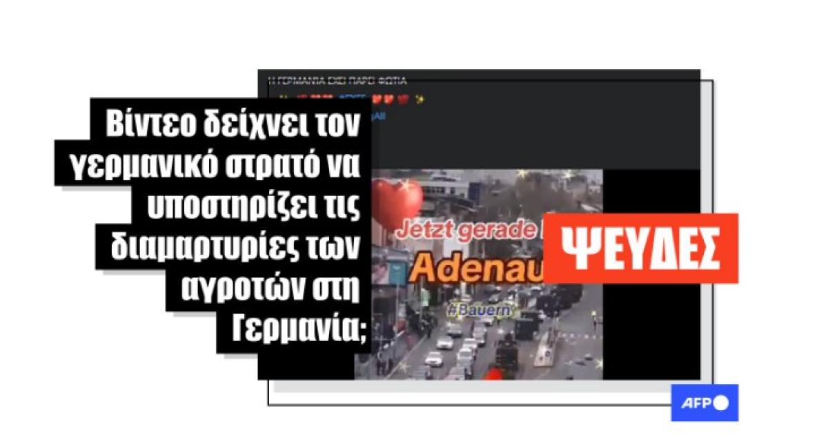 Στο βίντεο φαίνονται πολλά τανκς να κινούνται σε έναν δρόμο. Η σκηνή λέγεται ότι διαδραματίζεται στη μικρή πόλη Άντεναου, στο γερμανικό κρατίδιο Ρηνανία-Παλατινάτο, στις 13 Ιανουαρίου 2024, σύμφωνα με τον ισχυρισμό. «Χιλιάδες ένστολοι» φαίνονται να ταξιδεύουν στο Βερολίνο για να υποστηρίξουν τους αγρότες, όπως ισχυρίζεται το βίντεο στα γερμανικά.
