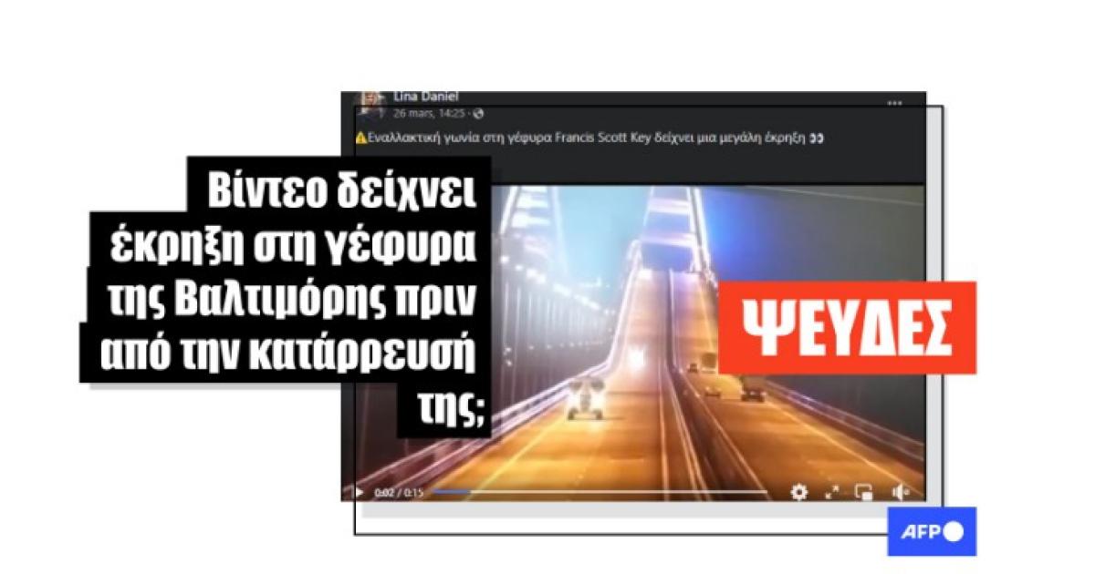 «Εναλλακτική γωνία στη γέφυρα Francis Scott Key δείχνει μια μεγάλη έκρηξη», γράφει μια ανάρτηση στο Facebook από τις 26 Μαρτίου 2024. Το βίντεο που κοινοποιήθηκε δείχνει οχήματα να κινούνται κατά μήκος μιας γέφυρας όταν ξαφνικά συμβαίνει μια τεράστια έκρηξη. Το ίδιο βίντεο με τον ίδιο ισχυρισμό κοινοποιήθηκε επίσης στο Facebook στα ελληνικά εδώ και εδώ.