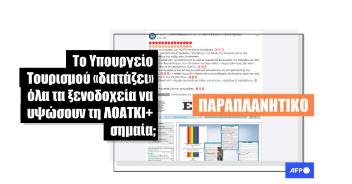 «Έπαρση της σημαίας των ΛΟΑΤΚΙ σε όλα τα ξενοδοχεία...‼️‼️‼️ Οργή και αποτροπιασμό προκαλεί η αποκάλυψη της Εστίας της Κυριακής για το νέο ανδραγάθημα της κυβέρνησης Μητσοτάκη», γράφει μια ανάρτηση στο Facebook στις 7 Απριλίου 2024. Η ανάρτηση περιλαμβάνει επίσης μια φωτογραφία που απεικονίζει το πρωτοσέλιδο της 7ης Απριλίου της συντηρητικής εφημερίδας «ΕΣΤΙΑ». «Έπαρση της σημαίας των ΛΟΑΤΚΙ σε όλα τα ξενοδοχεία της χώρας!», αναφέρει το πρωτοσέλιδο. «Με εντολή του Υπουργείου Τουρισμού», γράφει κάτω από τον τίτλο.