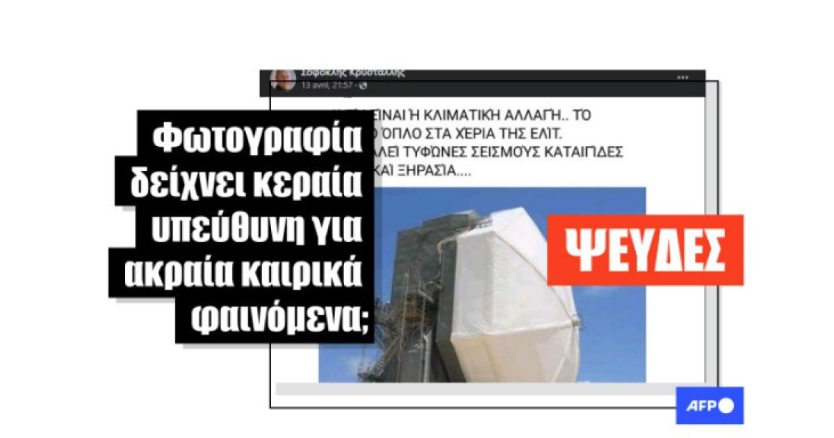 «Αυτή είναι η κλιματική αλλαγή... Το τέλειο όπλο στα χέρια της ελίτ. Προκαλεί τυφώνες, σεισμούς, καταιγίδες αλλά και ξηρασία...», γράφει μια ανάρτηση στο Facebook της 13ης Απριλίου 2024, η οποία έχει κοινοποιηθεί πάνω από 860 φορές από τότε.