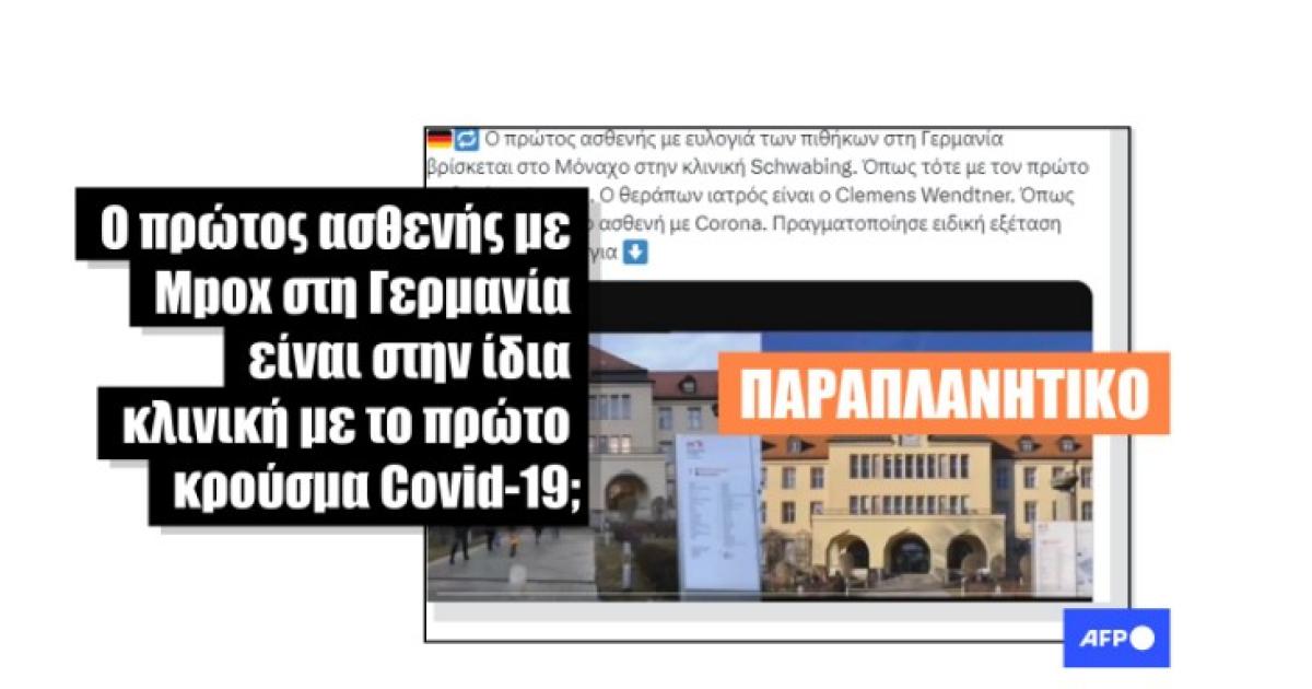 «Ο Πρώτος Άσθενής μέ ευλογιά των Πιθήκων στήν Γερμανία βρίσκεται στό Μόναχο στήν Κλινική Schwabing !! ΟΠΩς ΤΟΤΕ μέ τόν Πρώτο Άσθενή μέ Corona !! Ο θεράπων Ίατρός είναι ο Clemens Wendtner !! Όπως τότε μέ τόν Πρώτο Άσθενή μέ Corona !!!», γράφει αυτή η ανάρτηση στο Facebook από τις 19 Αυγούστου 2024.