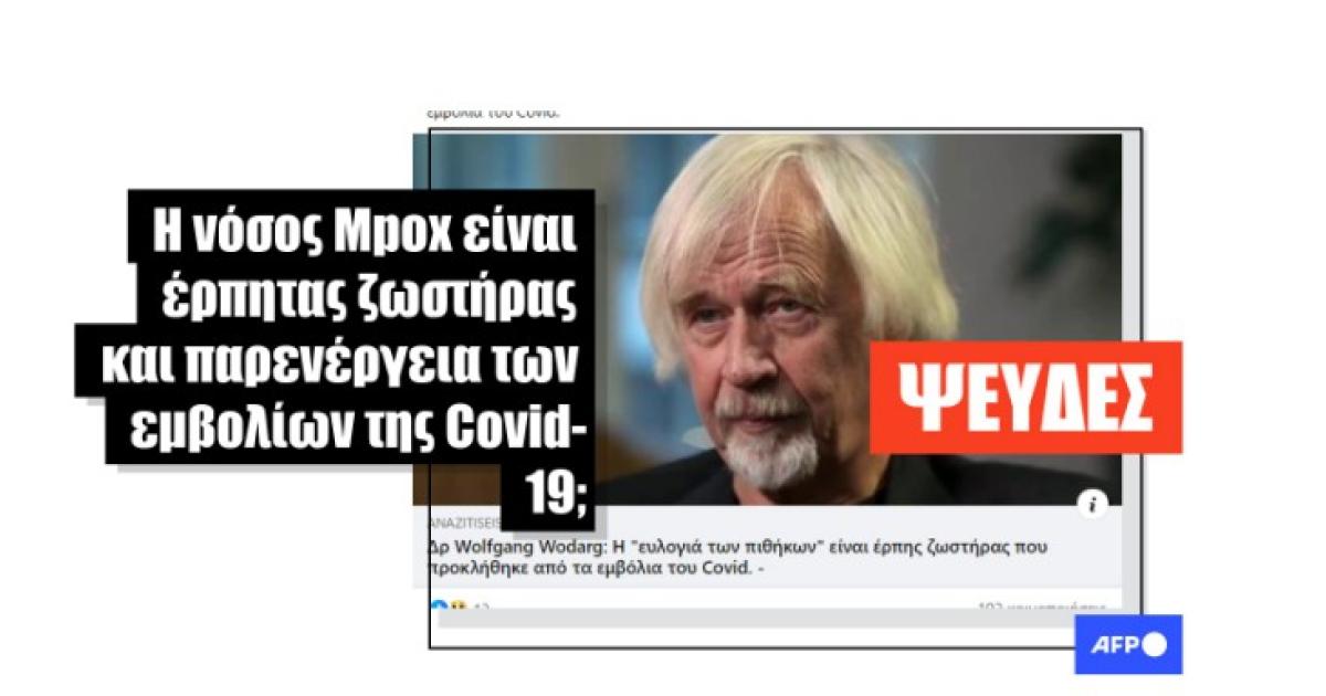 «Δρ Wolfgang Wodarg: Η “ευλογιά των πιθήκων” είναι έρπης ζωστήρας που προκλήθηκε από τα εμβόλια του Covid», γράφει αυτή η ανάρτηση στα ελληνικά από τις 21 Αυγούστου, κοινοποιώντας ένα άρθρο με τον ίδιο τίτλο.