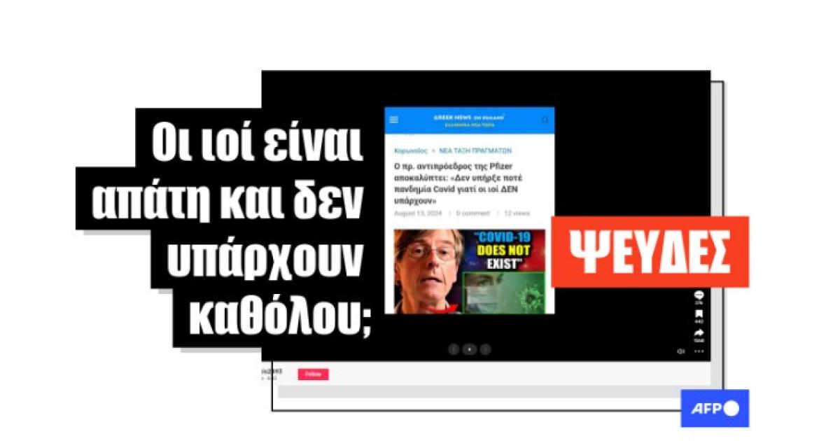 «Ο πρ. αντιπρόεδρος της Pfizer αποκαλύπτει: «Δεν υπήρξε ποτέ πανδημία Covid γιατί οι ιοί ΔΕΝ υπάρχουν», γράφει μια εικόνα σε ένα βίντεο στο TikTok από τις 13 Αυγούστου 2024, το οποίο κοινοποιήθηκε από τότε περισσότερες από 1.500 φορές. Η εικόνα μοιάζει να είναι ένα στιγμιότυπο οθόνης από αυτό το άρθρο που έχει ίδια ημερομηνία δημοσίευσης.