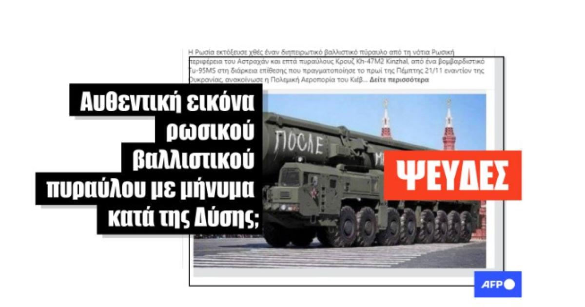 «ΝΕΟ ΜΗΝΥΜΑ ΤΗΣ ΡΩΣΙΑΣ ΠΡΟΣ ΤΗ ΔΥΣΗ. ΑΝΕΒΑΣΑΝ ΣΤΗΝ ΚΟΚΚΙΝΗ ΠΛΑΤΕΙΑ ΒΑΛΛΙΣΤΙΚΟ ΠΥΡΑΥΛΟ 'RS-26 RUBEZH' ΜΕ ΓΡΑΜΜΕΝΗ ΤΗ ΦΡΑΣΗ....'ΜΕΤΑ ΑΠΟ ΜΕΝΑ ΥΠΑΡΧΕΙ ΣΙΩΠΗ'», αναφέρει αυτή η ανάρτηση στο Facebook από τις 22 Νοεμβρίου. Η ανάρτηση περιλαμβάνει επίσης μια φωτογραφία ενός πυραύλου Topol-M. Στη φωτογραφία, στην επάνω πλευρά του πυραύλου, βλέπουμε γραμμένη στα ρωσικά με λευκά γράμματα τη φράση: «после меня только тишина», που σημαίνει «μετά από εμένα υπάρχει μόνο σιωπή».