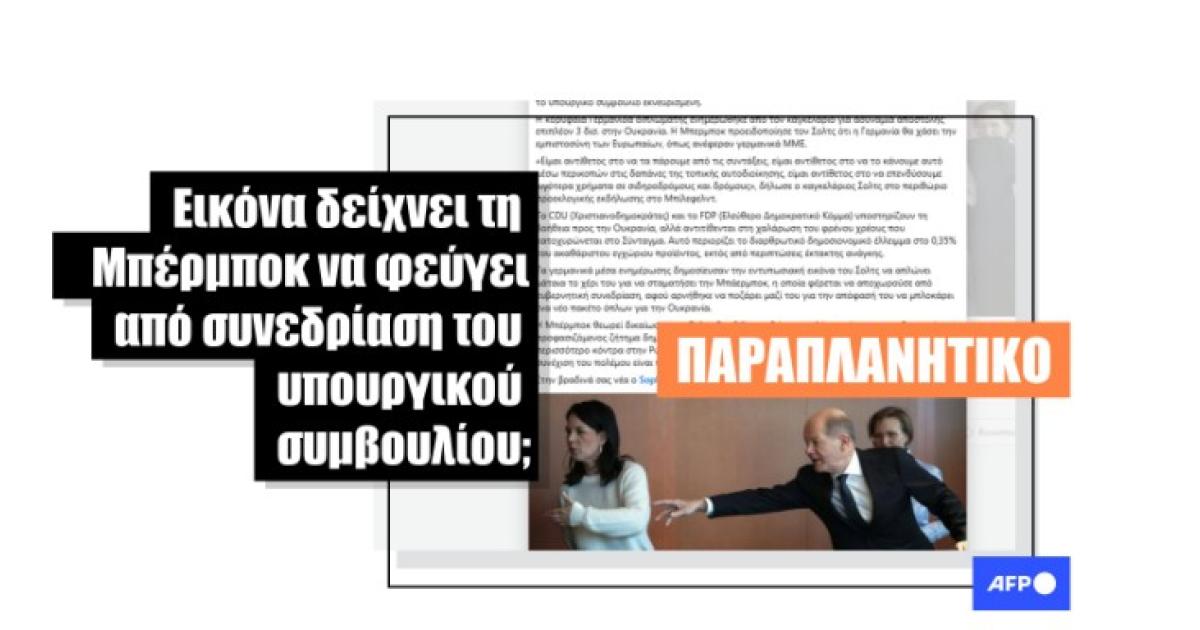 Ο χρήστης ισχυρίζεται ότι ο Σολτς άπλωσε το χέρι του για να «σταματήσει την Μπέρμποκ, η οποία φέρεται να αποχωρούσε από κυβερνητική συνεδρίαση» επειδή ο Γερμανός Καγκελάριος «μπλόκαρε ένα νέο πακέτο όπλων για την Ουκρανία».