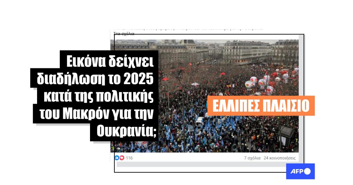 Αν και υπήρξε πράγματι μια διαδήλωση στη Γαλλία στις 8 Μαρτίου 2025, οργανωμένη από το ακροδεξιό πολιτικό κόμμα «Les patriotes», με επικεφαλής τον Φλοριάν Φιλιππό, κατά της εμπλοκής της Γαλλίας στην ουκρανική σύγκρουση, η φωτογραφία που κυκλοφορεί στα ελληνικά μέσα κοινωνικής δικτύωσης δεν είναι από αυτή τη διαδήλωση η οποία δεν συγκέντρωσε πάνω από μερικές δεκάδες άτομα, σύμφωνα με τα βίντεο (εδώ και εδώ) που το AFP μπόρεσε να ελέγξει. Στην πραγματικότητα, η εικόνα τραβήχτηκε το 2023 σε μια διαδήλωση στο Παρίσι κατά του σχεδίου μεταρρύθμισης του συνταξιοδοτικού συστήματος της γαλλικής κυβέρνησης εκείνης της εποχής.