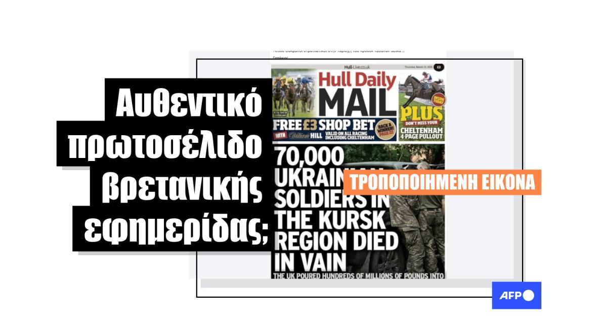 «Αγγλική Εφημεριδα...70.000 Ουκρανοί στρατιωτικοί στην περιοχή του Κρούσκ πέθαναν άδικα», γράφει αυτή η ανάρτηση στο Facebook από τις 16 Μαρτίου 2025, κοινοποιώντας μια εικόνα που υποτίθεται ότι δείχνει το πρωτοσέλιο της Hull Daily Mail, μιας περιφερειακής εφημερίδας στην πόλη-λιμάνι Χαλ στη βορειοανατολική Αγγλία, να γράφει: «70.000 Ουκρανοί στρατιώτες στην περιοχή του Κουρσκ πέθαναν μάταια. Το Ηνωμένο Βασίλειο έριξε εκατοντάδες εκατομμύρια λίρες στη συντριπτική αποτυχία του Ζελένσκι».