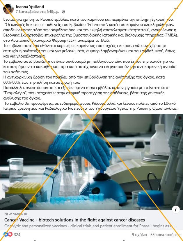 «Έτοιμο για χρήση το Ρωσικό εμβόλιο, κατά του καρκίνου και περιμένει την επίσημη έγκρισή του», αναφέρει αυτή η μακροσκελής ανάρτηση στο Facebook, η οποία έχει κοινοποιηθεί περισσότερες από 50 φορές. Παραποιώντας τα λόγια της Βερόνικα Σκβόρτσοβα, επικεφαλής της Ομοσπονδιακής Ιατρικής και Βιολογικής Υπηρεσίας της Ρωσίας, σε συνέντευξη που έδωσε στο ρωσικό μέσο ενημέρωσης Izvestia στις 5 Σεπτεμβρίου, η ανάρτηση συνεχίζει αναφέροντας ότι οι κλινικές δοκιμές του εμβολίου Enteromix κατά του καρκίνου έχουν ολοκληρωθεί, αποδεικνύοντας την «ασφάλεια και την υψηλή αποτελεσματικότητά» του.
