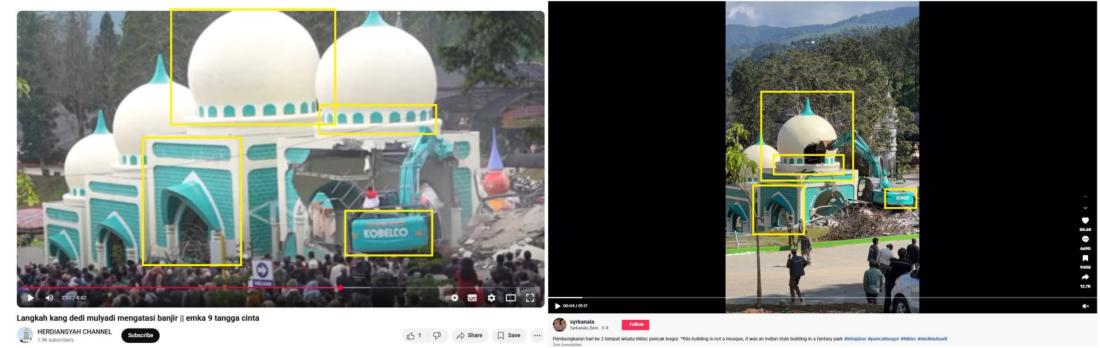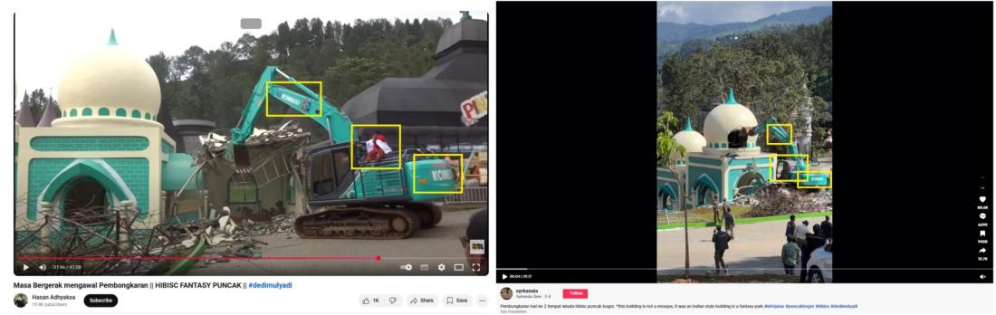 Μια αντίστροφη αναζήτηση εικόνας με βασικά καρέ από το βίντεο οδήγησε στον εντοπισμό του ίδιου κλιπ σε υψηλότερη ανάλυση, δημοσιευμένο στο TikTok στις 8 Μαρτίου 2025, με μια περιγραφή γραμμένη στα ινδονησιακά: «Αποξήλωση της δεύτερης ημέρας του τουριστικού αξιοθέατου Hibisc στο Πουνκάκ Μπογκόρ».