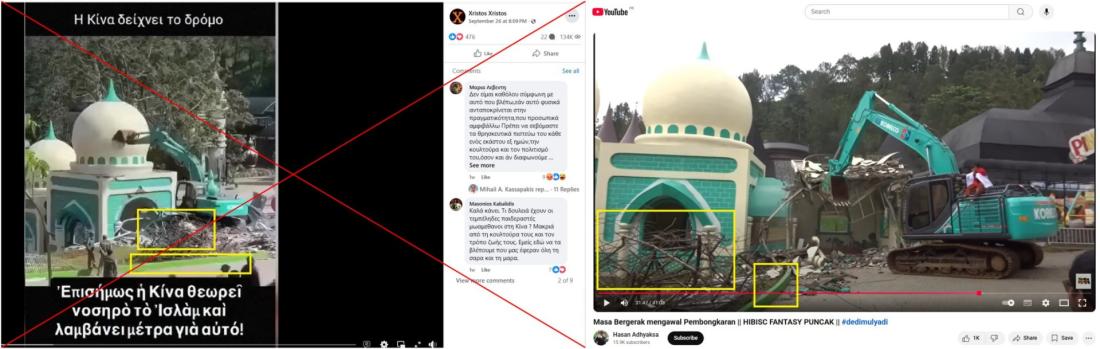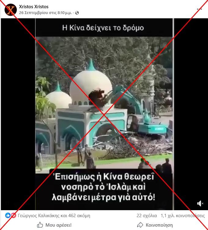 «Η Κίνα δείχνει τον δρόμο. Επισήμως, η Κίνα θεωρεί νοσηρό το Ισλάμ και λαμβάνει μέτρα για αυτό», αναφέρει το κείμενο σε ένα βίντεο που δημοσιεύτηκε στο Facebook στις 26 Σεπτεμβρίου 2025 και έχει κοινοποιηθεί από τότε περισσότερες από 1.100 φορές. Το απόσπασμα διάρκειας 45 δευτερολέπτων δείχνει έναν εκσκαφέα να γκρεμίζει ένα κτήριο με θολωτή οροφή που μοιάζει με τζαμί.