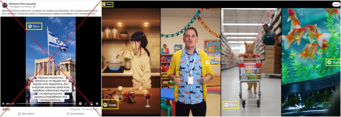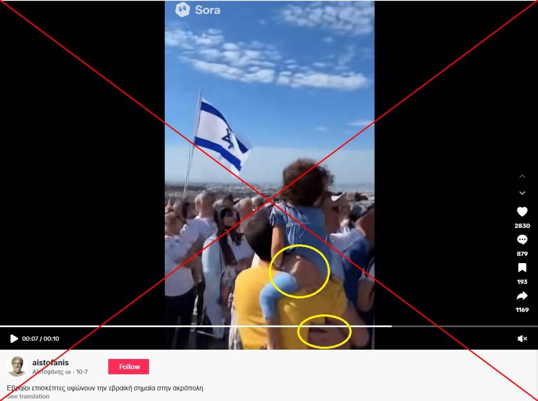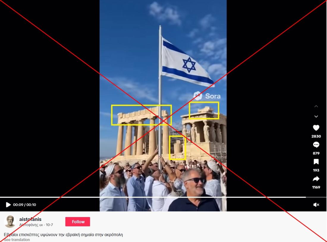Στις 7 Οκτωβρίου, δύο χρόνια μετά τη φονική επίθεση της Χαμάς στο Ισραήλ που πυροδότησε τον πόλεμο στη Λωρίδα της Γάζας, ένα βίντεο κυκλοφόρησε στα ελληνικά μέσα κοινωνικής δικτύωσης, το οποίο υποτίθεται ότι δείχνει μια ισραηλινή σημαία να κυματίζει κάτω από την Ακρόπολη στην Αθήνα. Χρήστες του διαδικτύου σχολίασαν τις αναρτήσεις με εθνικιστικό τόνο, γράφοντας ότι «η σημαία του Ισραήλ στην Ακρόπολη δεν ενόχλησε κανέναν», αλλά η ελληνική σημαία ενοχλεί, χωρίς όμως να διευκρινίζουν σε ποιο περιστατικό αναφέρονται. Ωστόσο, το AFP διαπίστωσε ότι το βίντεο δεν είναι αυθεντικό. Οπτικές ασυνέπειες, η παρουσία του λογότυπου ενός μοντέλου τεχνητής νοημοσύνης (AI) και τα αποτελέσματα ενός εργαλείου ανίχνευσης περιεχομένου παραγόμενου από AI, επιβεβαίωσαν ότι το βίντεο δημιουργήθηκε με τη χρήση τεχνητής νοημοσύνης.