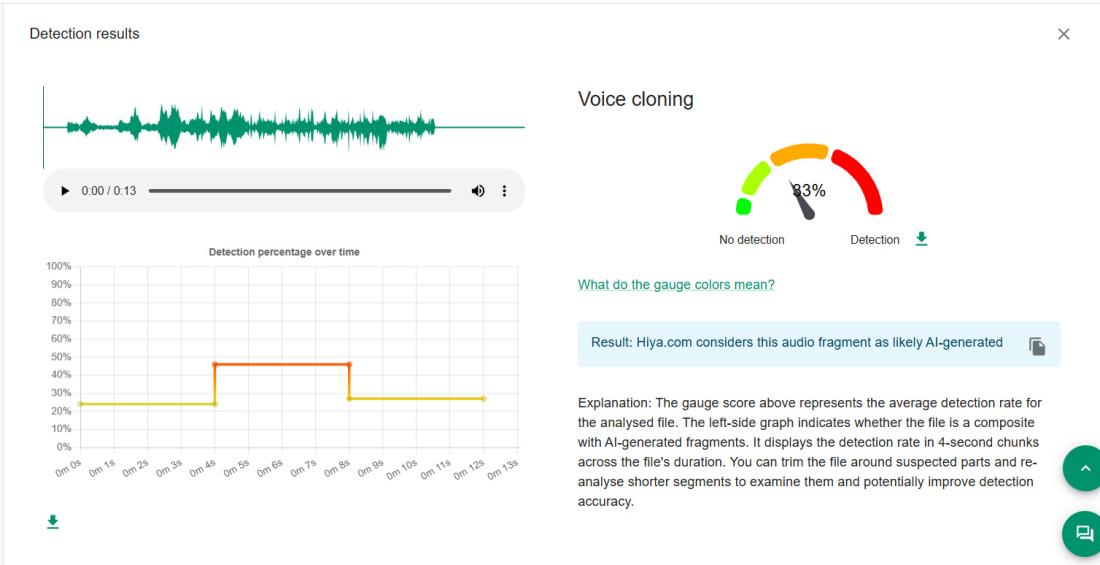 Η υπηρεσία επαλήθευσης γεγονότων του AFP εξήγαγε τον ήχο από το κοινοποιημένο βίντεο και τον ανέλυσε χρησιμοποιώντας το Hiya, το εργαλείο ανίχνευσης ήχου του προγράμματος InVID-WeVerify. Το αποτέλεσμα έδειξε ότι υπάρχει 33% πιθανότητα ο ήχος να έχει δημιουργηθεί τεχνητά, ποσοστό υψηλό για το Hiya, δεδομένου ότι ένα γνήσιο αρχείο θα πρέπει να εμφανίζει 0% ίχνη δημιουργίας από τεχνητή νοημοσύνη.