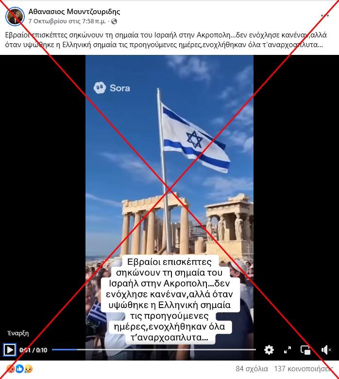 Αυτό το βίντεο δεν δείχνει μια πραγματική ισραηλινή σημαία υψωμένη κάτω από την Ακρόπολη αλλά δημιουργήθηκε με τεχνητή νοημοσύνη