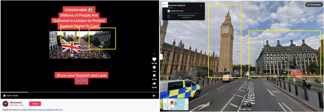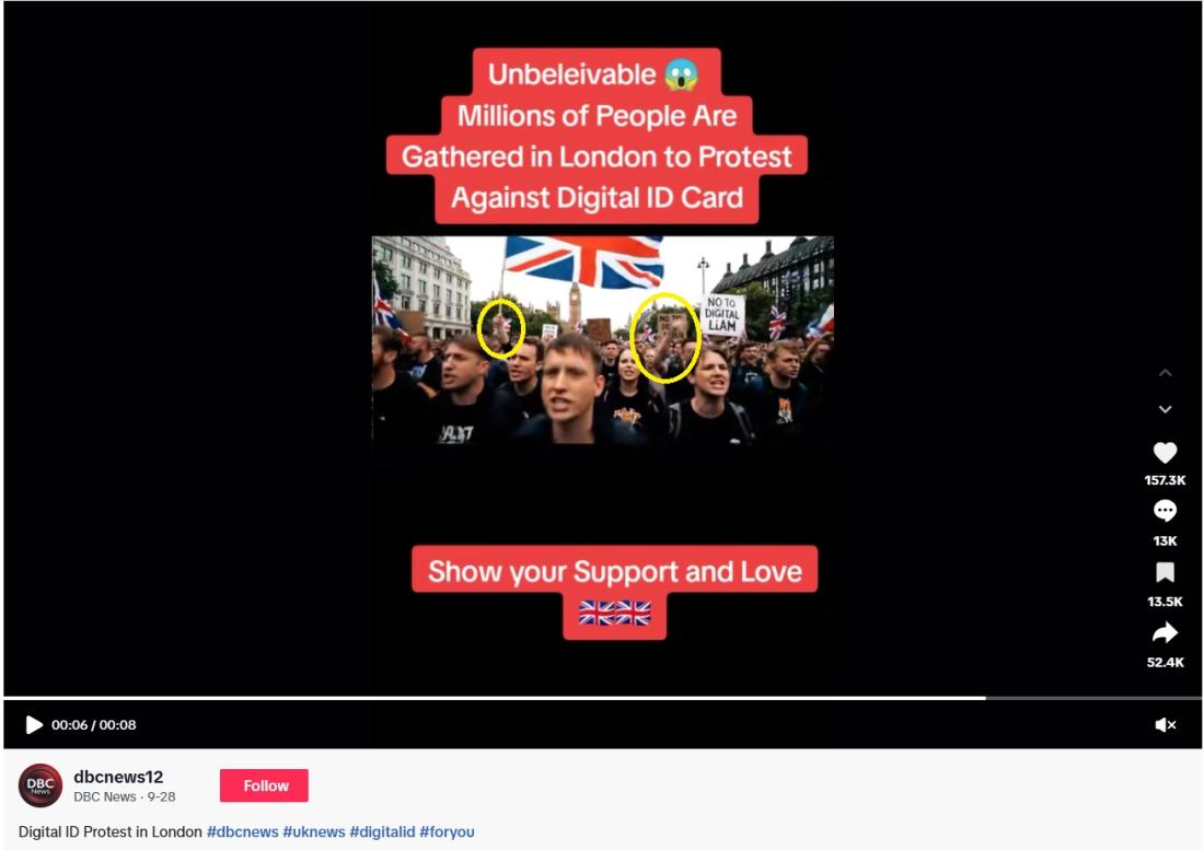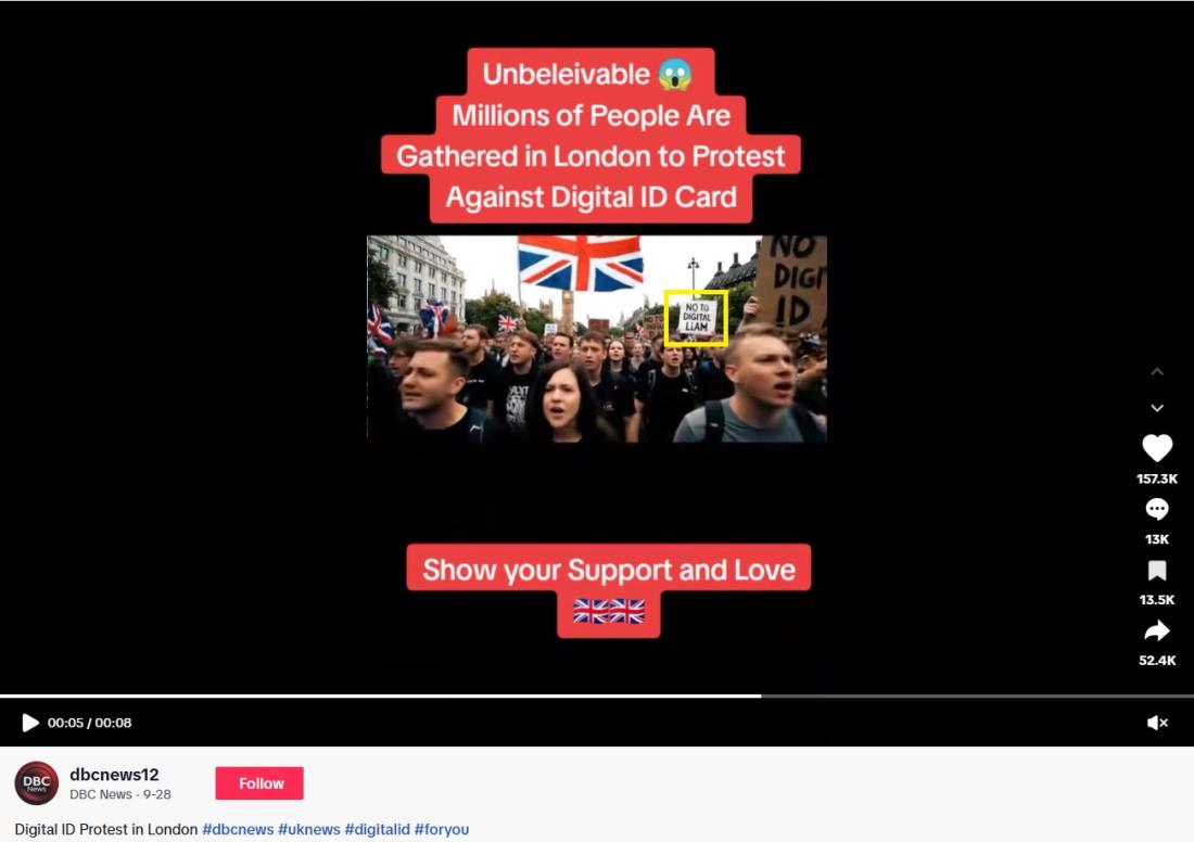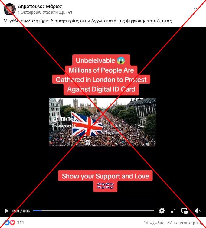 Σε αυτό το πλαίσιο, λίγες μέρες αργότερα, ένα βίντεο κυκλοφόρησε στο Facebook στα ελληνικά, το οποίο φέρεται να δείχνει μια μεγάλη διαδήλωση στο Λονδίνο κατά του συστήματος ψηφιακής ταυτότητας. Αυτή η ανάρτηση στο Facebook από τις 8 Οκτωβρίου 2025 αναφέρει: «Μεγάλο συλλαλητήριο διαμαρτυρίας στην Αγγλία κατά της ψηφιακής ταυτότητας». Περιλαμβάνει ένα βίντεο οκτώ δευτερολέπτων το οποίο δείχνει ένα τεράστιο πλήθος διαδηλωτών να κυματίζουν σημαίες του Ηνωμένου Βασιλείου, με φόντο ένα κτήριο που μοιάζει με το Παλάτι του Ουεστμίνστερ, όπου βρίσκεται το Βρετανικό Κοινοβούλιο. Ακούμε ανθρώπους να φωνάζουν στα αγγλικά το σύνθημα «Όχι στην ψηφιακή ταυτότητα» και «Λέμε όχι».