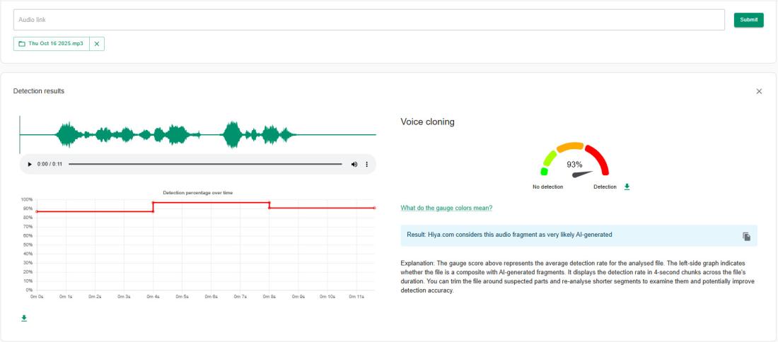 Το AFP εξήγαγε επίσης τον ήχο από το κοινοποιημένο βίντεο και τον ανέλυσε χρησιμοποιώντας το Hiya, το εργαλείο ανίχνευσης ήχου του εργαλείου InVID-WeVerify. Το αποτέλεσμα έδειξε 93% πιθανότητα ο ήχος να έχει δημιουργηθεί τεχνητά.