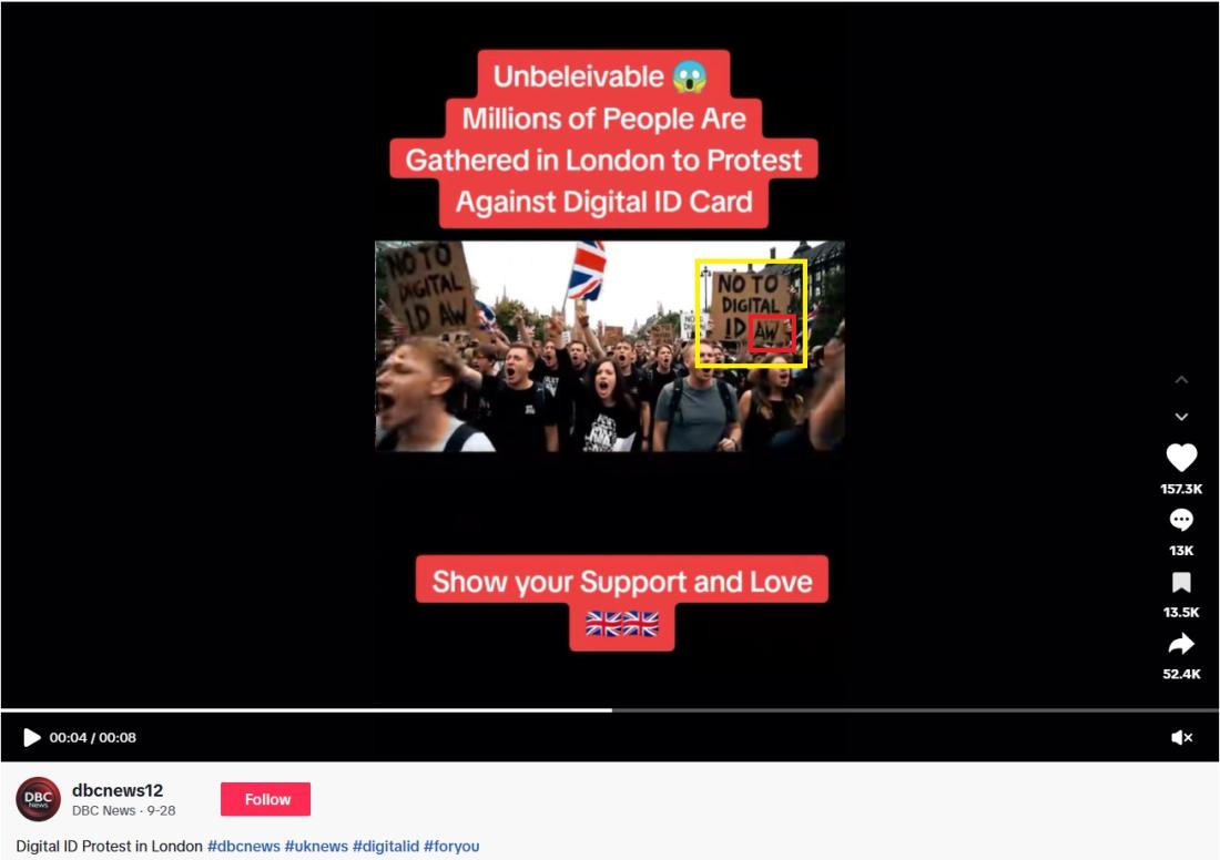 Αφού ο πρωθυπουργός του Ηνωμένου Βασιλείου Κιρ Στάρμερ ανακοίνωσε ένα σχέδιο ψηφιακής ταυτότητας σε μια προσπάθεια να περιορίσει την παράτυπη μετανάστευση, ένα βίντεο που δημιουργήθηκε με τεχνητή νοημοσύνη κυκλοφόρησε στο διαδίκτυο, με τον ισχυρισμό ότι δείχνει μια μεγάλη διαμαρτυρία στο Λονδίνο κατά του σχεδίου. Στην Ελλάδα, όπου οι νέες ταυτότητες θα είναι υποχρεωτικές έως το καλοκαίρι του 2026, ορισμένοι χρήστες υποστήριξαν ότι οι Βρετανοί είχαν δίκιο να εκφράσουν την αντίθεσή τους στην υποχρεωτική ψηφιακή ταυτότητα. Δεν υπήρξαν σημαντικές διαμαρτυρίες στην πρωτεύουσα του Ηνωμένου Βασιλείου σχετικά με τα σχέδια για την ψηφιακή ταυτότητα όταν κυκλοφόρησαν για πρώτη φορά οι αναρτήσεις. Ωστόσο, χιλιάδες άνθρωποι διαδήλωσαν στο κεντρικό Λονδίνο στις 18 Οκτωβρίου 2025. Το AFP εντόπισε, επίσης, οπτικά και ηχητικά στοιχεία που αποδείκνυαν ότι το βίντεο δεν είναι αυθεντικό.