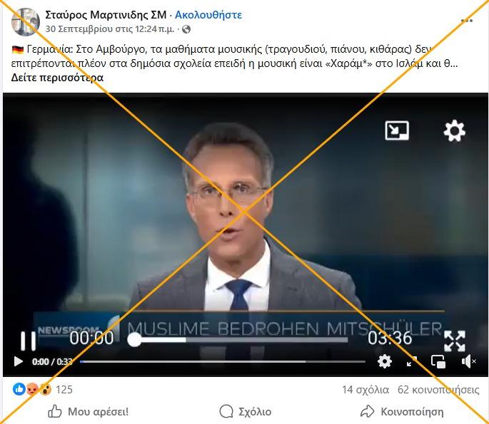 Η ανάρτηση περιλαμβάνει ένα βίντεο στο οποίο ένας παρουσιαστής ειδήσεων μιλάει για διακρίσεις από μουσουλμάνους μαθητές στο Αμβούργο και αναφέρει ότι ορισμένοι από αυτούς δεν συμμετείχαν σε μαθήματα μουσικής επειδή αυτό ήταν «χαράμ», δηλαδή απαγορευμένο σύμφωνα με την ισλαμική πίστη.