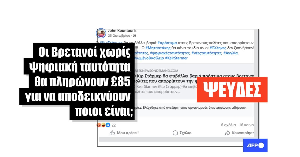 «Ο Κιρ Στάρμερ θα επιβάλλει βαριά πρόστιμα στους Βρετανούς πολίτες που απορρίπτουν την ψηφιακή ταυτότητα», γράφει αυτή η ανάρτηση στο Facebook από τις 25 Οκτωβρίου 2025. Η ανάρτηση περιλαμβάνει έναν υπερσύνδεσμο που οδηγεί σε ένα ελληνικό άρθρο το οποίο επικαλείται ως πηγή του το ηλεκτρονικό μέσο The People's Voice, το οποίο έχει επανειλημμένα ελεγχθεί από το AFP για διάδοση παραπληροφόρησης – για παράδειγμα, εδώ, εδώ και εδώ.