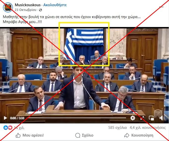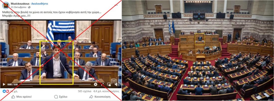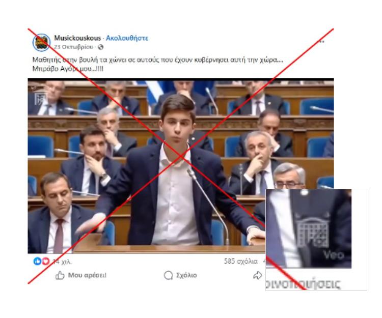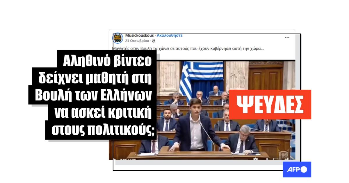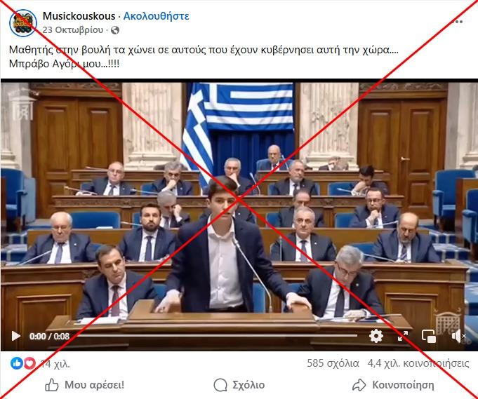 «Μαθητής στην βουλή τα χώνει σε αυτούς που έχουν κυβέρνησει αυτή την χώρα. Μπράβο Αγόρι μου!», γράφει η λεζάντα αυτής της ανάρτησης στο Facebook από τις 23 Οκτωβρίου 2025, η οποία έχει κοινοποιηθεί έκτοτε περισσότερες από 4.400 φορές. Η ανάρτηση περιλαμβάνει ένα βίντεο οκτώ δευτερολέπτων που δείχνει ένα νεαρό αγόρι με κοστούμι να στέκεται σε ένα βήμα και να μιλάει σε κάτι που μοιάζει να είναι ένα κοινοβούλιο ή ένα κυβερνητικό κτήριο, ενώ πίσω του φαίνονται άνδρες με κοστούμια να κάθονται σε έδρανα.