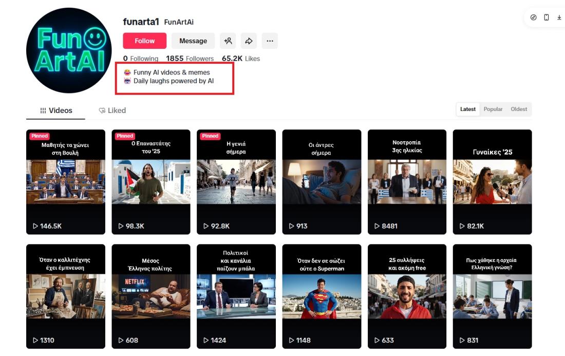 Μια πιο προσεκτική εξέταση αυτού του βίντεο στο Facebook δείχνει ότι το όνομα χρήστη του TikTok «@funarta1» είναι ορατό. Μια αναζήτηση με αυτό το όνομα χρήστη στο TikTok μάς οδήγησε σε αυτό που φαίνεται να είναι το αρχικό βίντεο σε υψηλότερη ανάλυση. Αναρτήθηκε στο TikTok στις 22 Οκτωβρίου 2025 από έναν χρήστη που δηλώνει στο προφίλ του: «Αστεία βίντεο τεχνητής νοημοσύνης & memes. Καθημερινά γέλια με τη δύναμη της τεχνητής νοημοσύνης».