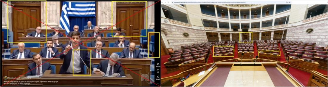Μια σύγκριση στιγμιότυπων οθόνης μεταξύ του βίντεο και μιας πραγματικής εικόνας του ελληνικού κοινοβουλίου αποδεικνύει την ύπαρξη περισσότερων οπτικών ασυνεπειών (αρχειοθετημένος σύνδεσμος). Για παράδειγμα, το χρώμα των πραγματικών κοινοβουλευτικών εδράνων είναι καφέ και όχι μπλε όπως φαίνεται στο βίντεο.