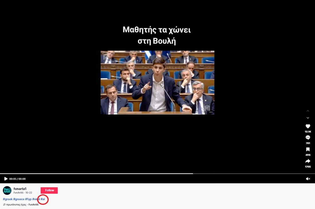 Επιπλέον, η ανάρτηση στο TikTok έχει μια ετικέτα (hashtag) #ai, υποδεικνύοντας ότι το βίντεο δημιουργήθηκε με τεχνητή νοημοσύνη.