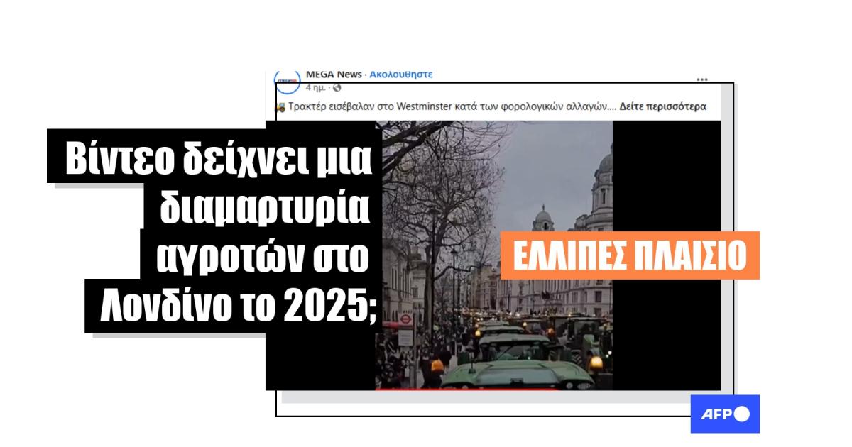 Έλληνες αγρότες και κτηνοτρόφοι μπλοκάρουν μεγάλους αυτοκινητόδρομους και οργανώνουν κινητοποιήσεις σε όλη τη χώρα για να διαμαρτυρηθούν, μεταξύ άλλων, για τις καθυστερημένες πληρωμές των επιδοτήσεων της Ευρωπαϊκής Ένωσης (ΕΕ). Σε αυτό το πλαίσιο, ένα βίντεο άρχισε να κυκλοφορεί στα ελληνικά μέσα κοινωνικής δικτύωσης με τον ισχυρισμό ότι δείχνει μια πρόσφατη διαμαρτυρία αγροτών στην πρωτεύουσα του Ηνωμένου Βασιλείου, το Λονδίνο, παραλληλίζοντάς τη με τη δυσαρέσκεια των Ελλήνων αγροτών. Ωστόσο, μια έρευνα του AFP διαπίστωσε ότι το βίντεο έχει αφαιρεθεί από το πλαίσιό του και στην πραγματικότητα τραβήχτηκε το 2024.
