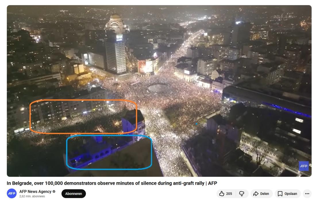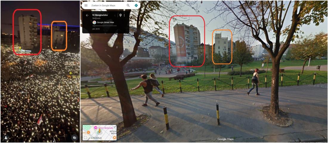 Ένας δημοσιογράφος του AFP στο Βελιγράδι αναγνώρισε επίσης την τοποθεσία του βίντεο ως την πλατεία Σλάβια, μία από τις μεγαλύτερες στην πρωτεύουσα της Σερβίας. Εντοπίσαμε το ακριβές σημείο όπου τραβήχτηκε το βίντεο στους χάρτες της Google: σε μία από τις πολυκατοικίες στην οδό Μπεογκράντσκα (Beogradska), απέναντι από ένα πάρκο όπου συγκεντρώθηκαν οι διαδηλωτές. Τα κτήρια στο βάθος ταιριάζουν με αυτά στο Google Street View.