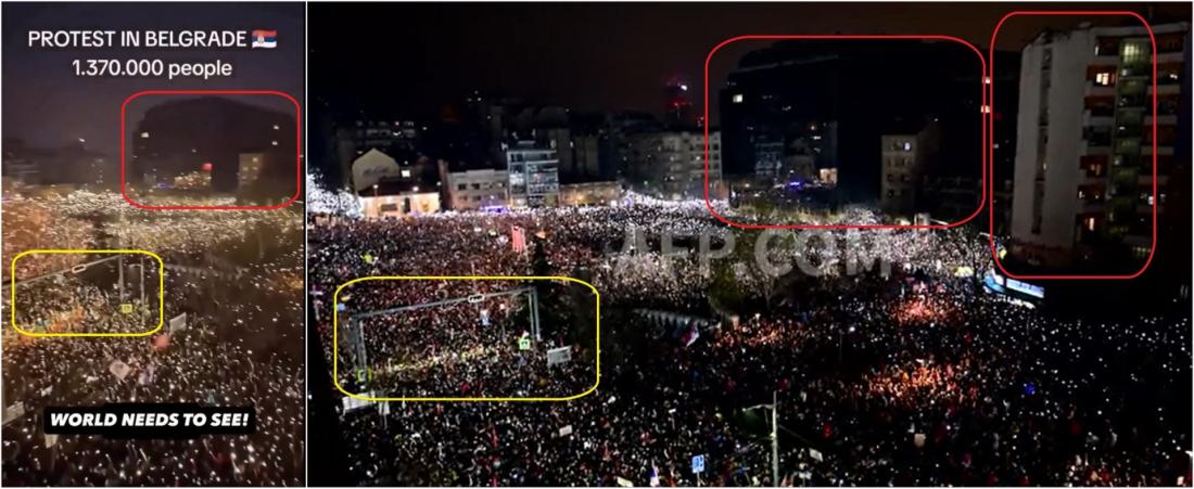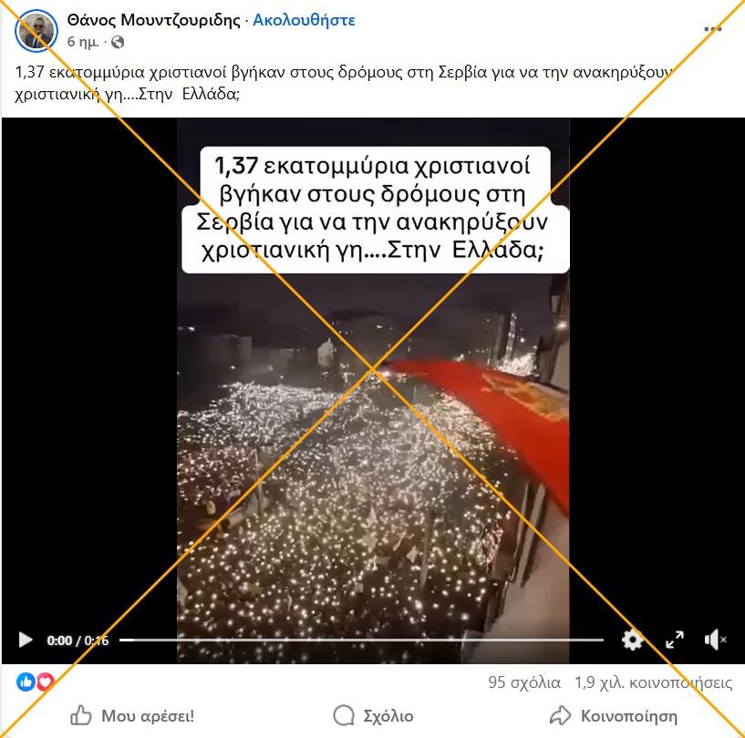 «1,37 εκατομμύρια χριστιανοί βγήκαν στους δρόμους στη Σερβία για να την ανακηρύξουν χριστιανική γη….Στην Ελλάδα;», αναφέρει στα ελληνικά η περιγραφή ενός βίντεο στο Facebook από τις 10 Δεκεμβρίου 2025, το οποίο έχει έκτοτε κοινοποιηθεί περισσότερες από 1,9 χιλιάδες φορές. Στο βίντεο, ένα τεράστιο πλήθος στέκεται σε μια μεγάλη πλατεία στην πρωτεύουσα της Σερβίας, το Βελιγράδι, κυματίζοντας σερβικές σημαίες. Τα πλάνα τραβήχτηκαν από το μπαλκόνι ενός διαμερίσματος.