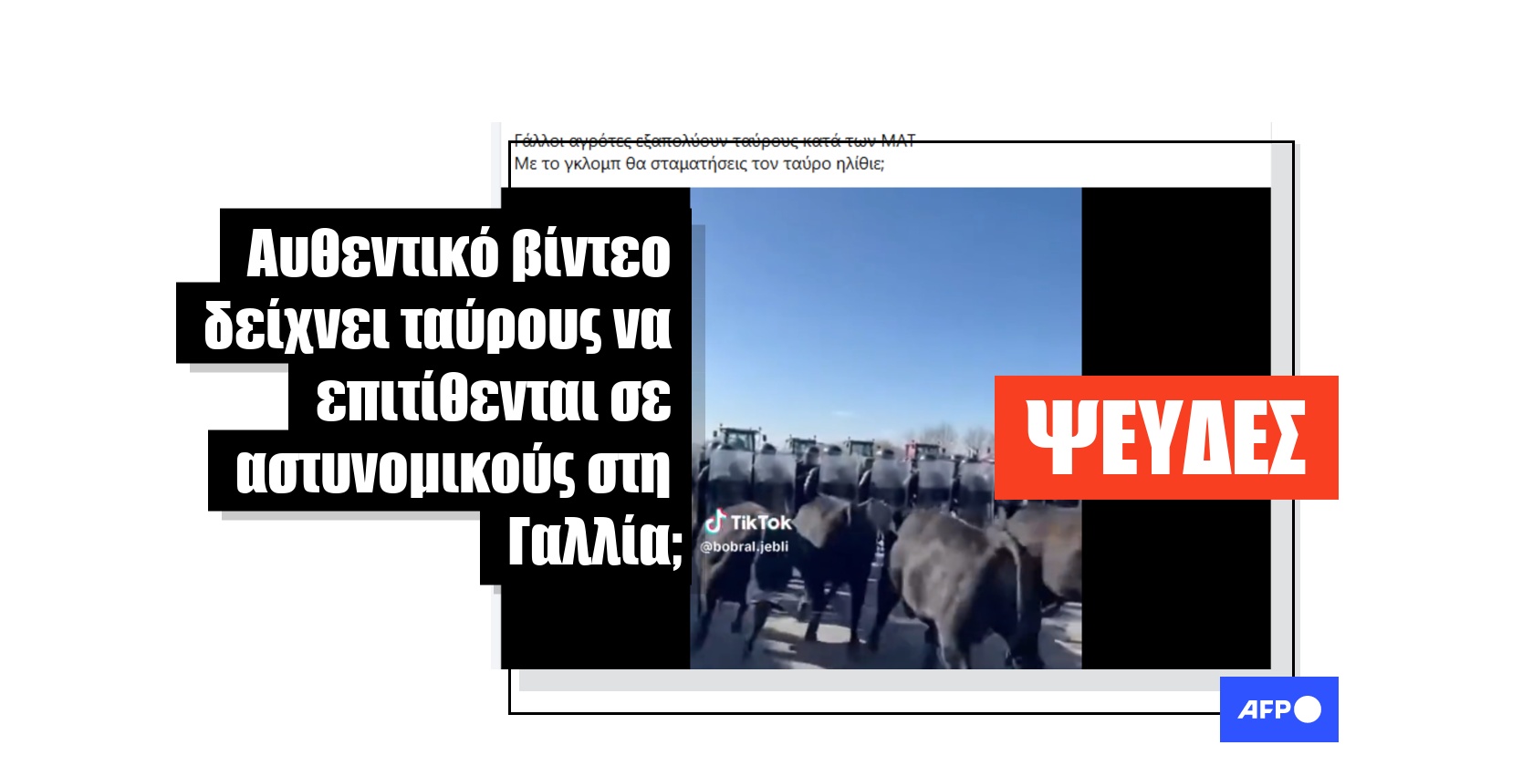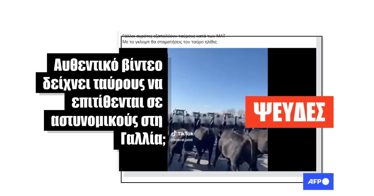 «Γάλλοι αγρότες εξαπολύουν ταύρους κατά των ΜΑΤ», αναφέρει αυτή η ανάρτηση στο Facebook από τις 10 Ιανουαρίου 2026, η οποία περιλαμβάνει ένα βίντεο 15 δευτερολέπτων που δείχνει υποτιθέμενους ταύρους να επιτίθενται σε αστυνομικούς. Η ανάρτηση έχει έκτοτε κοινοποιηθεί περισσότερες από 1.000 φορές.