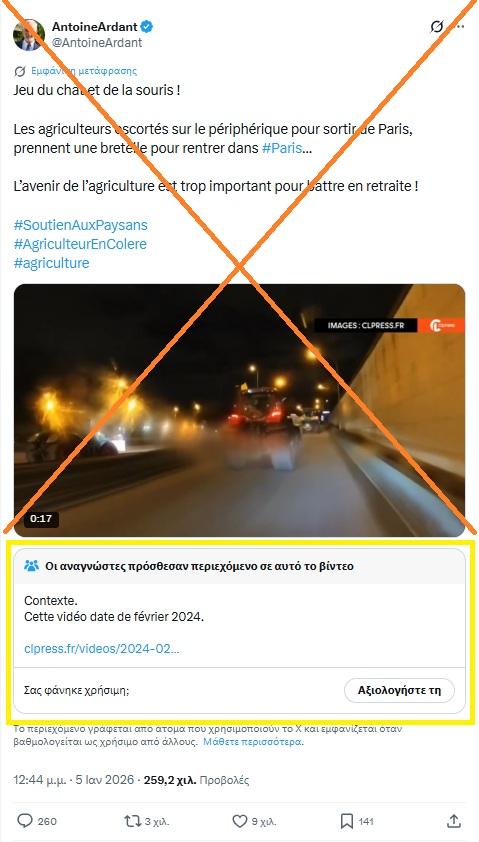Ωστόσο, το βίντεο τραβήχτηκε το 2024 και δεν σχετίζεται με τις τρέχουσες διαμαρτυρίες των αγροτών στη Γαλλία.