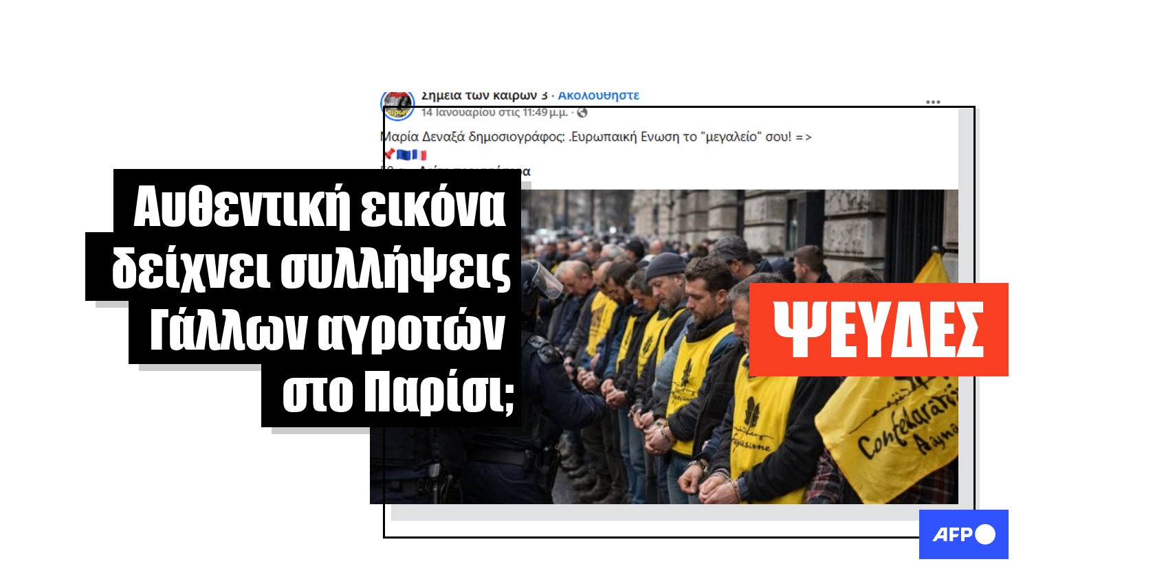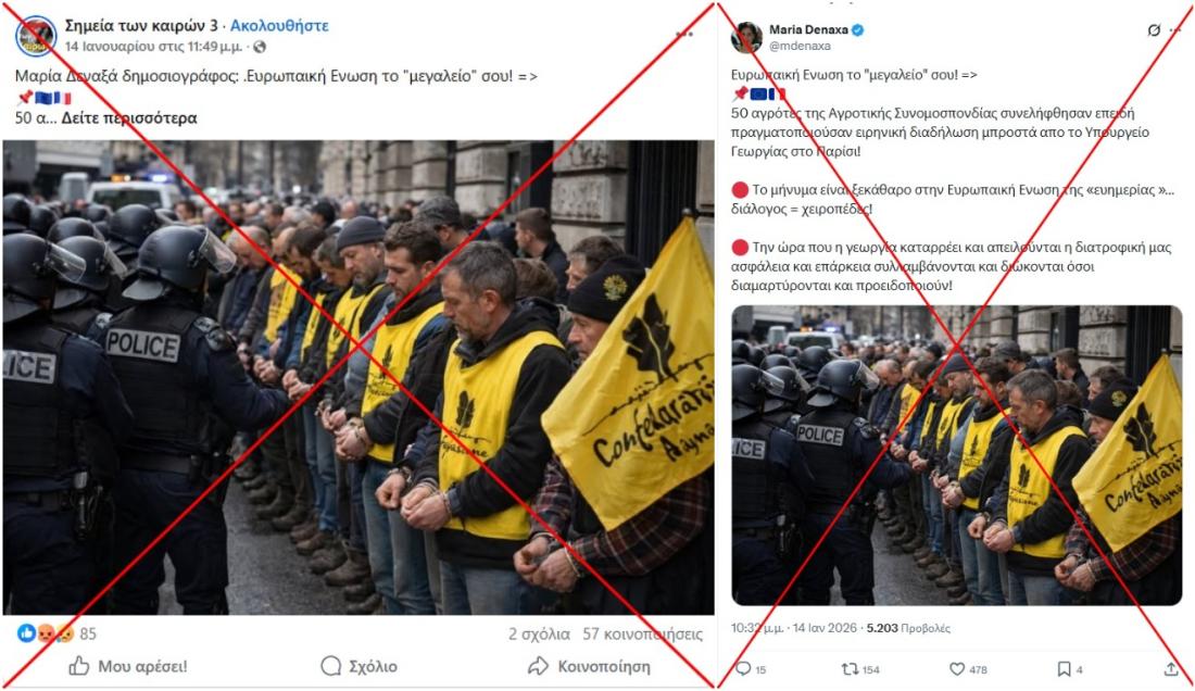 «50 αγρότες της Αγροτικής Συνομοσπονδίας συνελήφθησαν επειδή πραγματοποιούσαν ειρηνική διαδήλωση μπροστά απο το Υπουργείο Γεωργίας στο Παρίσι», αναφέρει αυτή η ανάρτηση στο Facebook από τις 14 Ιανουαρίου 2026, η οποία περιλαμβάνει μια εικόνα που δείχνει άνδρες παρατεταγμένους σε σειρά, φορώντας κίτρινα γιλέκα και με δεμένα τα χέρια τους, ενώ αστυνομικοί στέκονται μπροστά τους. Η ανάρτηση έχει έκτοτε κοινοποιηθεί περισσότερες από 50 φορές.