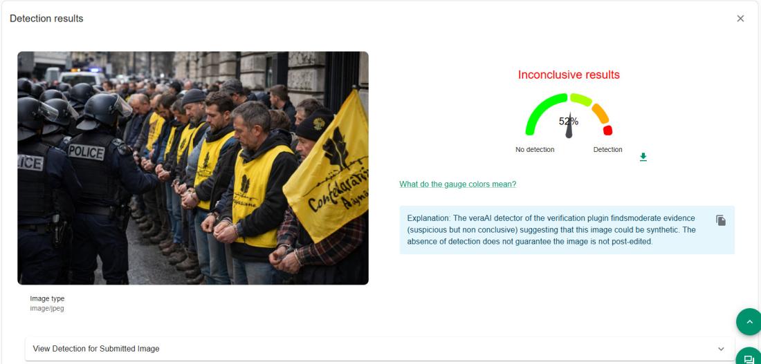 Αναλύσαμε την εικόνα χρησιμοποιώντας το εργαλείο InVID-WeVerify, στην ανάπτυξη του οποίου συνέβαλε το AFP, το οποίο κατέληξε στο συμπέρασμα ότι υπάρχει 52% πιθανότητα η εικόνα να είναι συνθετική.
