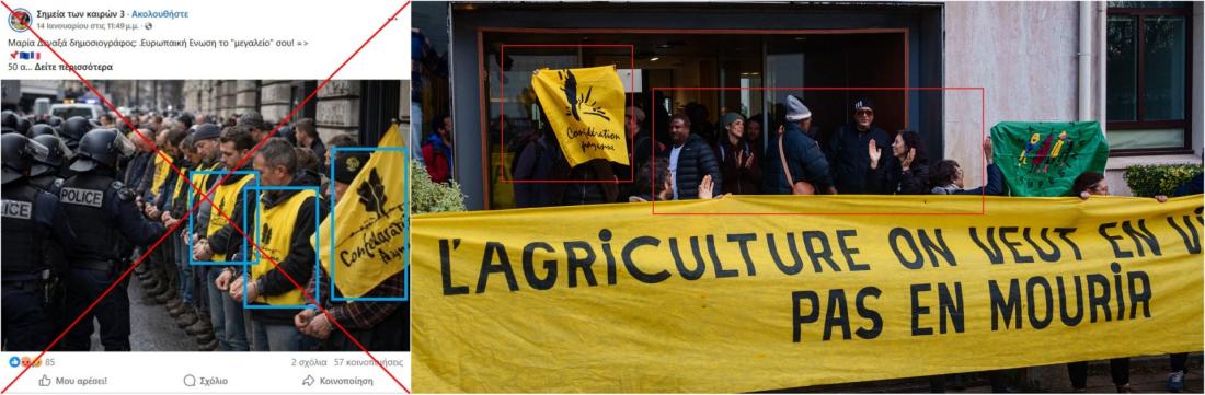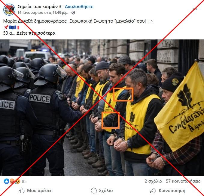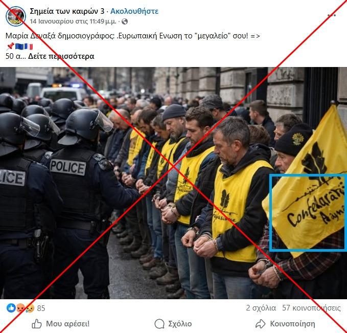 Η εικόνα με τον ισχυρισμό κυκλοφόρησε την ίδια ημέρα που 50 αγρότες –σύμφωνα με έναν πρώτο απολογισμό της αστυνομίας– συνελήφθησαν και τέθηκαν υπό κράτηση στο Παρίσι για «διατάραξη της δημόσιας τάξης» και για διάφορα «ποινικά αδικήματα», σύμφωνα με την αστυνομία (αρχειοθετημένο εδώ).