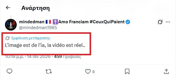 Στα σχόλια, ο χρήστης του X που δημοσίευσε αρχικά την εικόνα, μαζί με ένα άλλο βίντεο, έγραψε στα γαλλικά ότι «Η εικόνα δημιουργήθηκε από τεχνητή νοημοσύνη. Το βίντεο είναι πραγματικό».