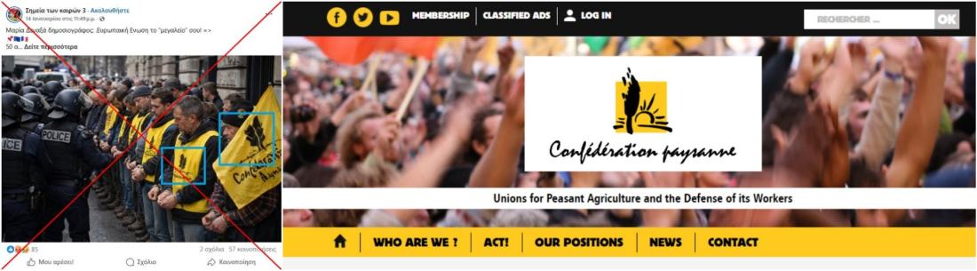 Η σύγκριση επιβεβαιώνει το διαφορετικό λογότυπο στη σημαία της Συνομοσπονδίας Αγροτών και το γεγονός ότι οι αγρότες δεν φαίνεται να φορούν κίτρινες μπλούζες.