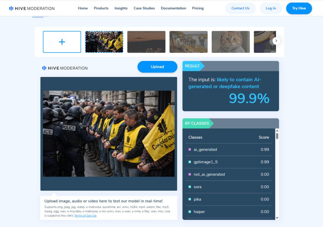Αναλύσαμε επίσης την εικόνα μέσω του εργαλείου ανίχνευσης τεχνητής νοημοσύνης του Hive Moderation, το οποίο έδωσε 99,9% πιθανότητα αυτή να περιέχει «περιεχόμενο που δημιουργήθηκε από τεχνητή νοημοσύνη ή deepfake».
