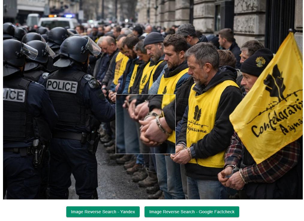 Στις 14 Ιανουαρίου 2026, 52 αγρότες διαδηλωτές συνελήφθησαν στο Παρίσι αφού εισέβαλαν σε ένα κτήριο του Υπουργείου Γεωργίας, ως ένδειξη οργής για την αντίδραση της κυβέρνησης στα αιτήματα του κλάδου. Στο πλαίσιο αυτό, κυκλοφόρησε στα μέσα κοινωνικής δικτύωσης μια εικόνα που υποτίθεται ότι έδειχνε τη στιγμή των συλλήψεων. Ωστόσο, η εικόνα δεν είναι γνήσια, όπως διαπίστωσε το AFP βασιζόμενο σε πολλαπλές οπτικές ασυνέπειες και ανάλυση μέσω εργαλείων ανίχνευσης τεχνητής νοημοσύνης (AI).