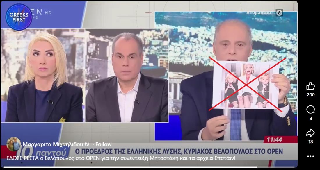 Στις 3 Φεβρουαρίου, ο Έλληνας πολιτικός και ηγέτης του εθνικιστικού πολιτικού κόμματος «Ελληνική Λύση», Κυριάκος Βελόπουλος, εξέφρασε την άποψή του για την υπόθεση Έπσταϊν κατά τη διάρκεια τηλεοπτικής συνέντευξης στο κανάλι OPEN TV.