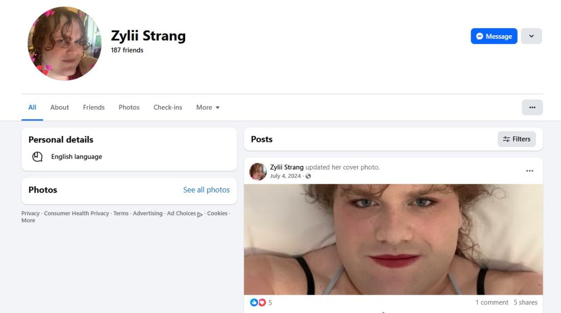 Μια αντίστροφη αναζήτηση εικόνας οδήγησε σε ένα προφίλ στο Facebook που έφερε το όνομα Ζίλι Στράνγκ («Zylii Strang») και την ευρέως διαδεδομένη εικόνα με το πλαίσιο με τα σχήματα καρδιάς ως εικόνα προφίλ του, όπως φαίνεται στο παρακάτω στιγμιότυπο οθόνης. Η φωτογραφία εξωφύλλου του λογαριασμού, που απεικονίζει το άτομο από ψηλά, είναι η δεύτερη φωτογραφία που χρησιμοποιήθηκε για τη διάδοση των ισχυρισμών που την ταυτοποιούσαν ψευδώς ως την φερόμενη δράστιδα.