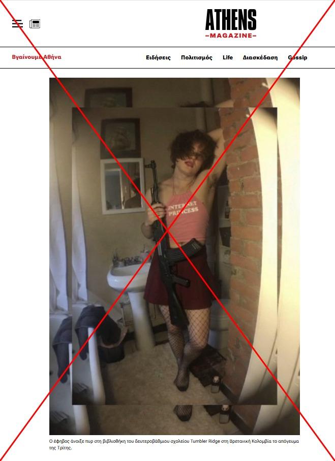 Τις ώρες που ακολούθησαν την τραγωδία που άφησε εννέα νεκρούς και 25 τραυματίες σε σχολείο δευτεροβάθμιας εκπαίδευσης της πόλης Τάμπλερ Ριτζ, μιας μικρής απομακρυσμένης πόλης στα δυτικά του Καναδά, οι φωτογραφίες μιας νεαρής Καναδής τρανς γυναίκας κυκλοφόρησαν σε πολλά διαδικτυακά άρθρα, δελτία ειδήσεων και μέσα κοινωνικής δικτύωσης στα ελληνικά με τον ψευδή ισχυρισμό ότι πρόκειται για τη δράστιδα της επίθεσης (αρχειοθετημένο εδώ).