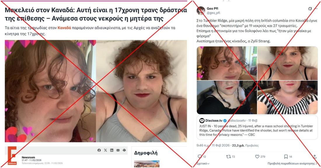 «Μακελειό στον Καναδά: Αυτή είναι η 17χρονη τρανς δράστρια της επίθεσης», γράφει για παράδειγμα ο τίτλος ενός άρθρου στα ελληνικά από τις 11 Φεβρουαρίου 2026, κοινοποιώντας φωτογραφίες μιας γυναίκας με σγουρά μαλλιά. Μία από αυτές τις εικόνες περιβάλλεται από ένα πλαίσιο με μικρές καρδιές ενώ μια άλλη είναι τραβηγμένη από ψηλά.